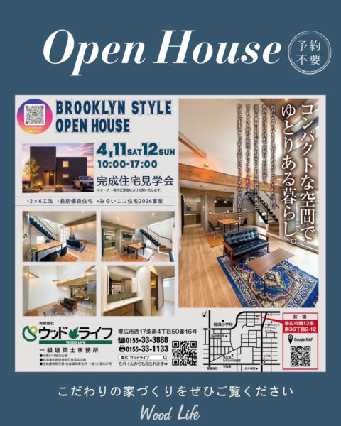 ブルックリンスタイルの完成住宅見学会開催 コンパクトな空間でゆとりある暮らし 帯広市内 4/11・12(土日)