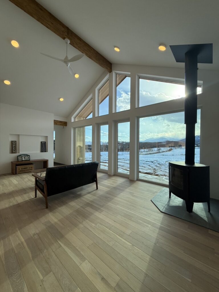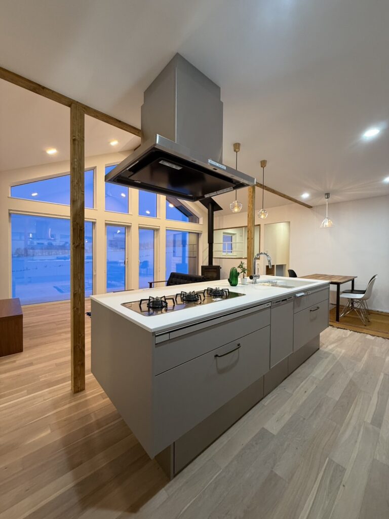 平屋住宅「四季を楽しめる最高のロケーションのある暮らし」芽室町Tさま邸 キッチン欧風スタイルナチュラル芽室町吹抜 眺望性と採光性を兼ね備えた大開口窓、広々としたLDKには薪ストーブ、今話題の空間を有効活用したヌック、肌触りの良い挽き板のフローリング、断熱性に優れたトリプルサッシなどこだわりの詰まった住宅です。